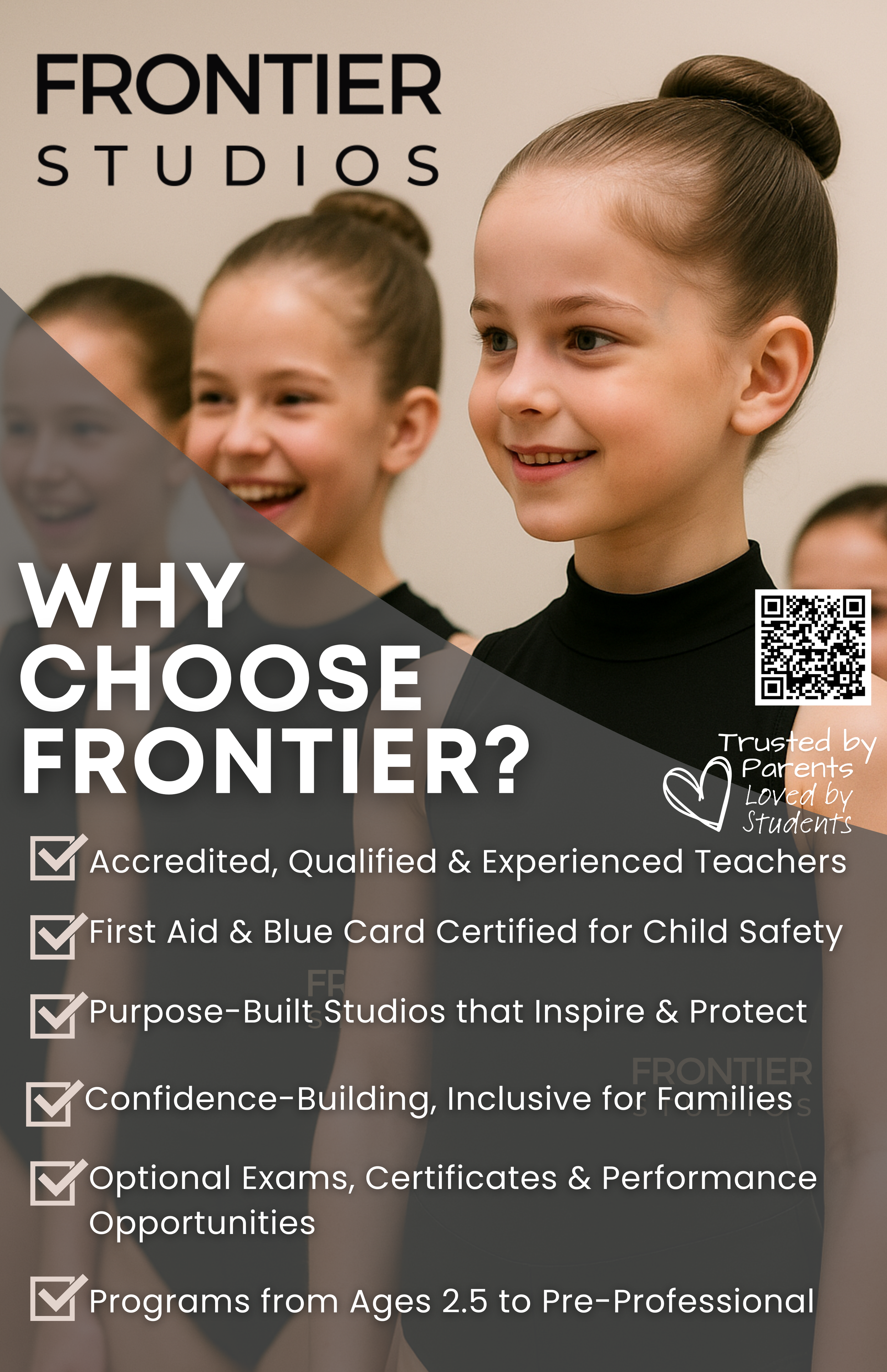 Our goals are simple yet impactful: to offer top-tier training that challenges and motivates, to provide opportunities for growth through performances, competitions, exams and recreational classes, and to cultivate a culture of encouragement and respect. Whether you're stepping into our studio for the first time or you're a seasoned performer, Frontier Studios is where your journey to greatness begins.